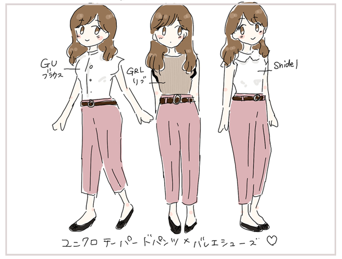 ボトムスはUNIQLOで購入したピンクのテーパードパンツ、足元はオリエンタルトラフィックのバレエシューズです。黒靴と決まってますので、足元は固定。
