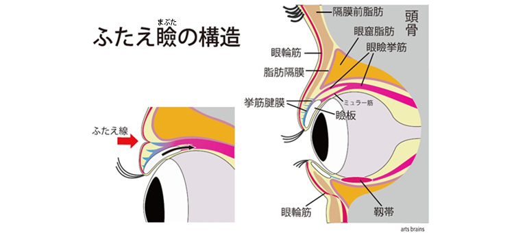 まぶたの形を決める要素には大きく3つあると言われています。1つは、右側の目の上にあるオレンジの部分、「眼窩脂肪(がんかしぼう)」。まゆげとまぶたの間にくぼみがあると思いますが、その奥にある黄色く塗られた部分の脂肪のことです。この脂肪が増えるにつれ、奥ぶたえやひとえに近づきます。大人になるにつれ、身体の脂肪が落ち、ふたえになることがあるのは、この脂肪も減っているからです。