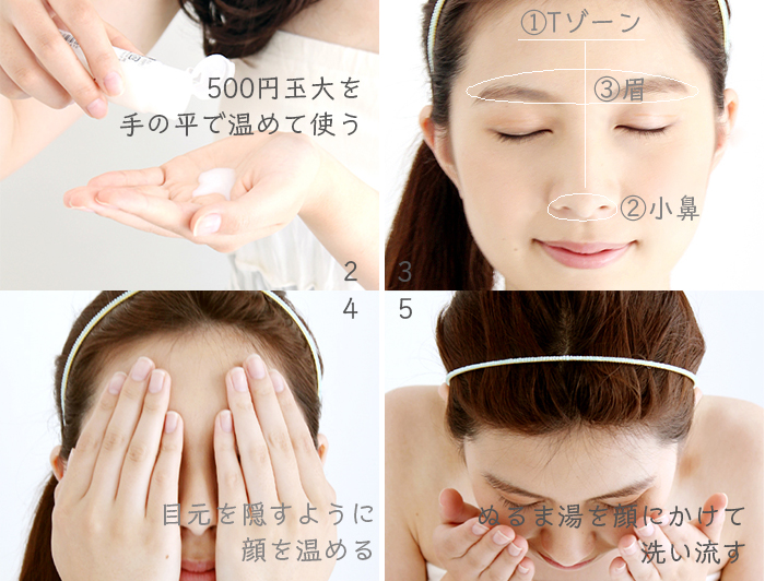 2、500円玉大のクレンジング剤を手の平に出し温める。