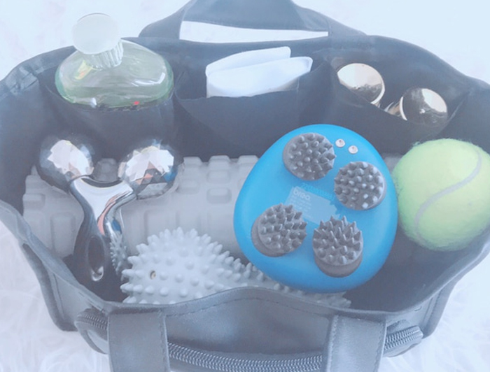気になった時にすぐ取り出せるように、美容グッズはバッグにまとめて。リビングや寝室など好きな場所に持ち歩いて使えるので便利です^^。