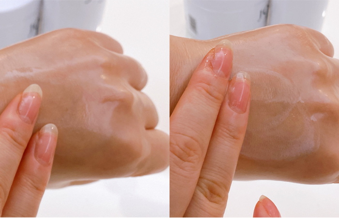 乳化がされると、手触りがスルッと軽くなり写真右のように白濁され始めます。