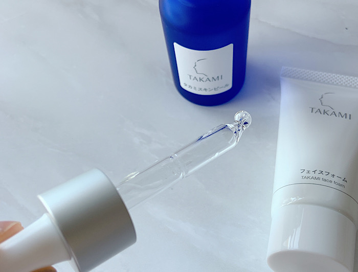 タカミスキンピールという角質美容水を使います。日々の洗顔後の肌にスポイトで適量を出し、肌になじませたら3分待ち、その後は普段通りのスキンケアをするだけ。