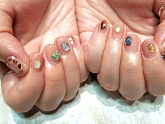 10本全部に違う天然石やぷくぷくしたデザインをのせていきます!ベースカラーを肌馴染みのいいカラーをセレクトすることで全体にまとまりがでます。