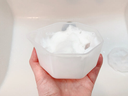 洗顔料を使う日は、泡でなでるように洗い、乾きやすい頬は避けても◎。泡立てるのが面倒な方は、100円ショップで買える泡だて器やネットを使うのがおすすめ。洗い終わったら、タオルで押さえるように水分オフし、すぐに保湿をしてくださいね。