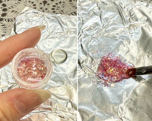 まずはラメジェルを準備します。市販のラメ入りジェルでもOKですが、クリアジェルに自分でラメやホログラムを混ぜると、より好みに合った仕上がりになります。混ぜるときのポイントは、少し“もったり”とするくらいの粘度に仕上げること。サラサラすぎると塗ったラメが広がってしまい、狙った位置にとどめるのが難しくなるからです。微調整が効くテクスチャーにしておくと、後の工程がぐっと楽になります。