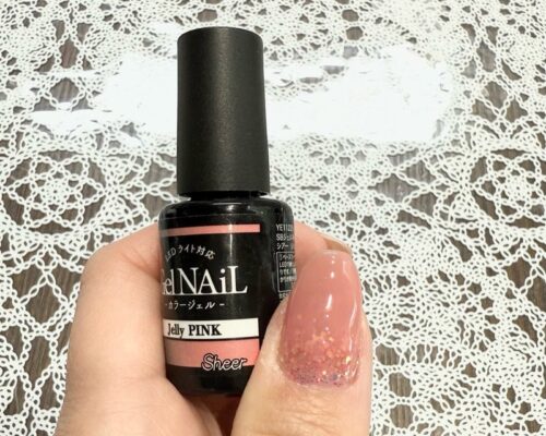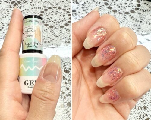 最後に、透明感のあるシアーピンクを全体に薄く塗ることで、ラメと肌の色を自然になじませていきます。このひと手間で一気に“サロン仕上がり”のような完成度に。もしラメとカラーの境目に段差がある場合は、このタイミングでジェルを重ねて整えておくとベストです。最後にトップジェルでコーティングして硬化すれば、ツヤ感と強度もアップ。シンプルながらも、指先がふんわりと光を反射する、上品なネイルが完成します。