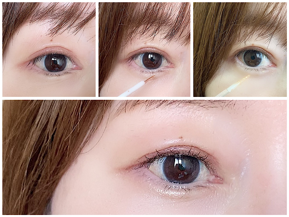 涙袋に塗るのは、ベージュのリキッドライナーです。リキッドライナーは肌にピタッと密着して崩れにくいので、ヨレやすい下まぶたメイクにもってこいのアイテム。