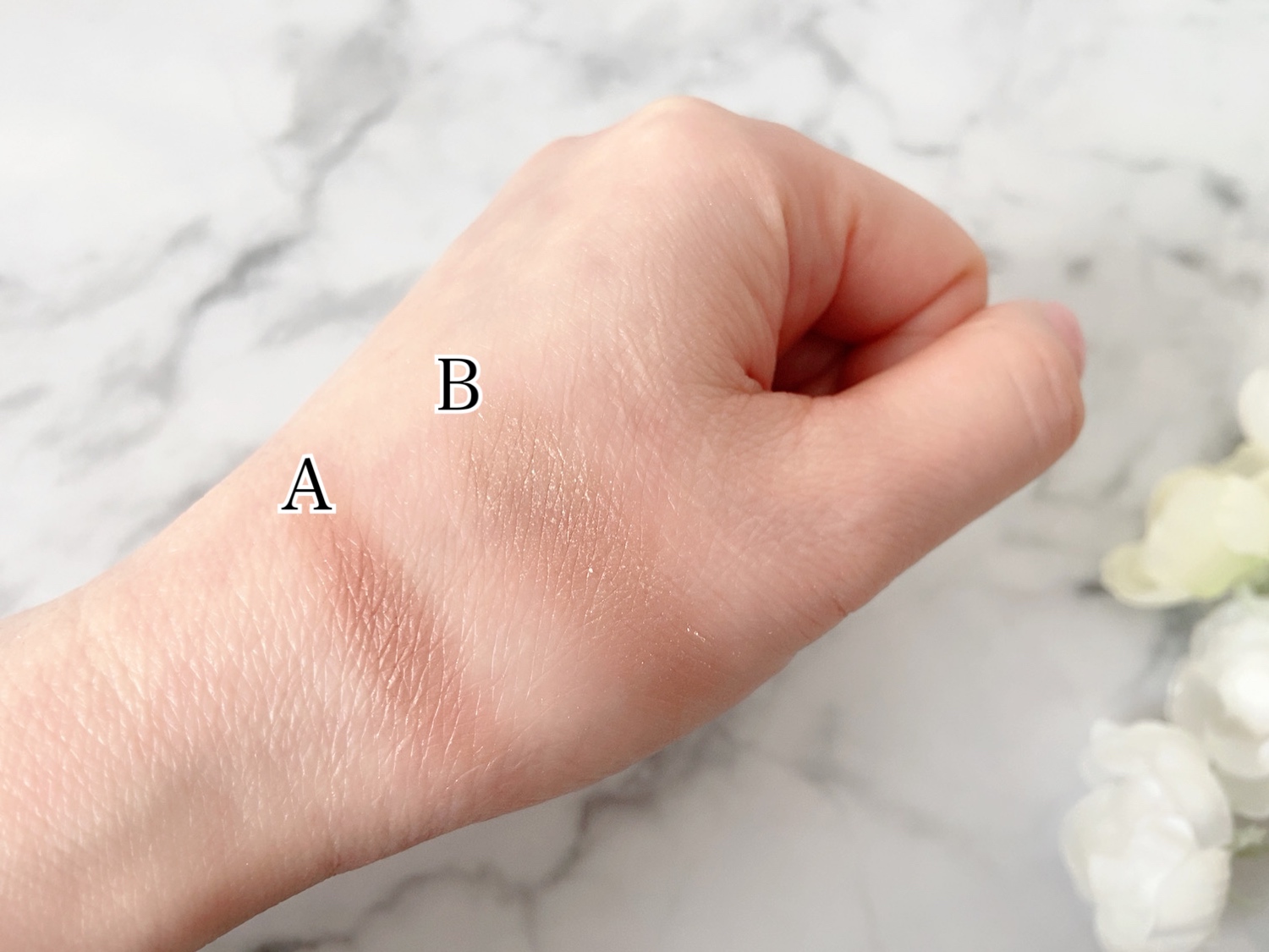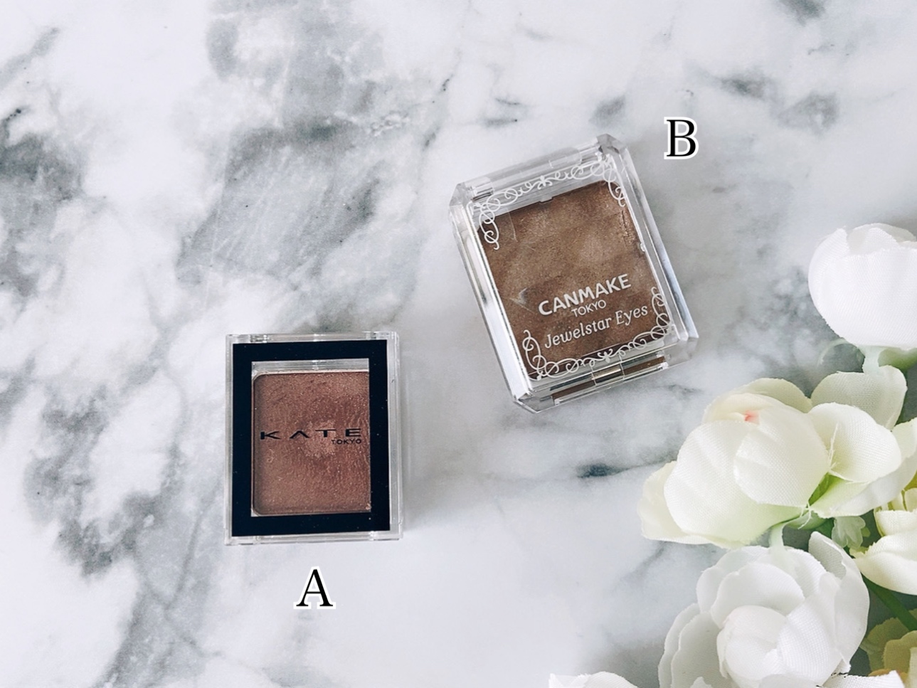 Aは「KATE/ザ アイカラー」026 レッドブラウン(税込価格715円)です。細かなパール入りの赤みブラウンは、くすんで見えがちな目元を華やかに見せます。二重幅と下瞼の目尻にアイシャドウブラシを使ってふわっと塗ります。Bは「キャンメイク/ジュエルスターアイズ」16 ジュエリーシュガーベージュ(税込価格638円)です。パールとラメが配合してあるから、目を閉じたり開けたりするとキラキラと輝いてきれい。アイホール部分とAを塗った上に、指を使って重ね塗りします。