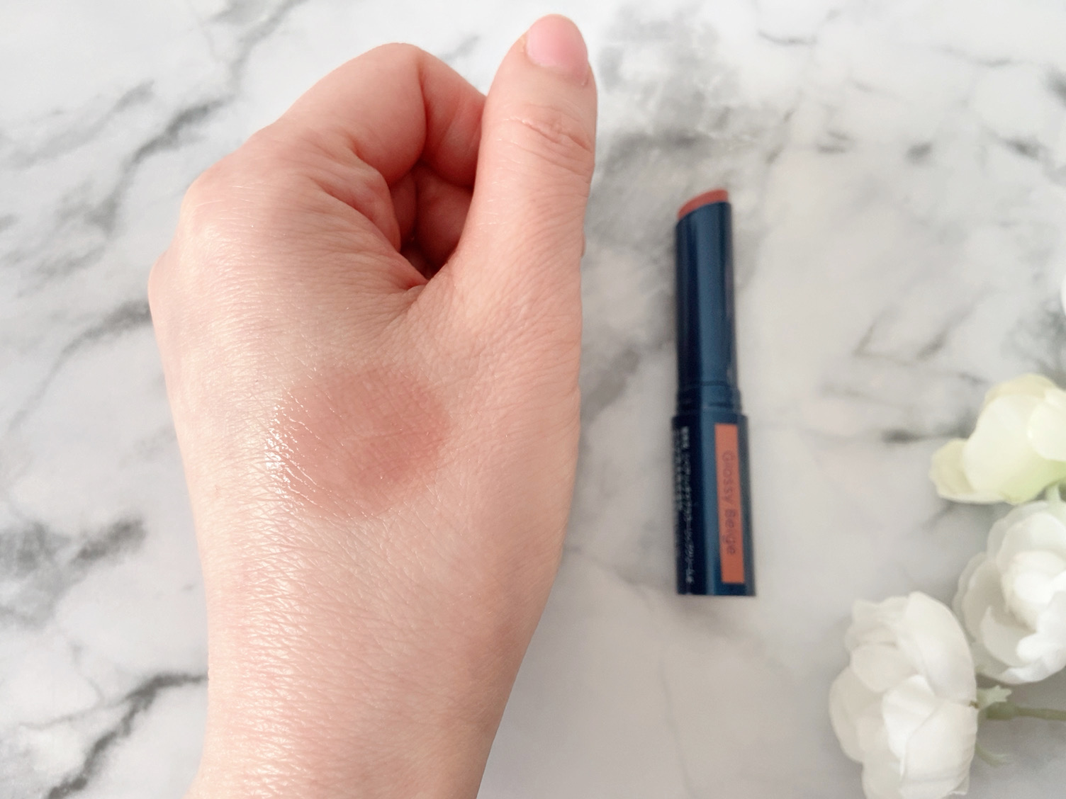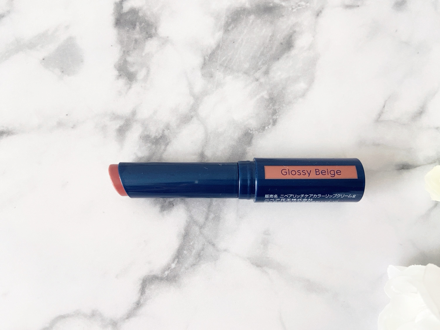 「ベージュリップは顔色が悪く見えるから苦手」という人も多いようですが、ツヤツヤっとしたものを選ぶとヘルシーな印象を与えられます。今回使ったのは「ニベア リッチケア&カラーリップ」グロッシーベージュ(税込価格770円)です。