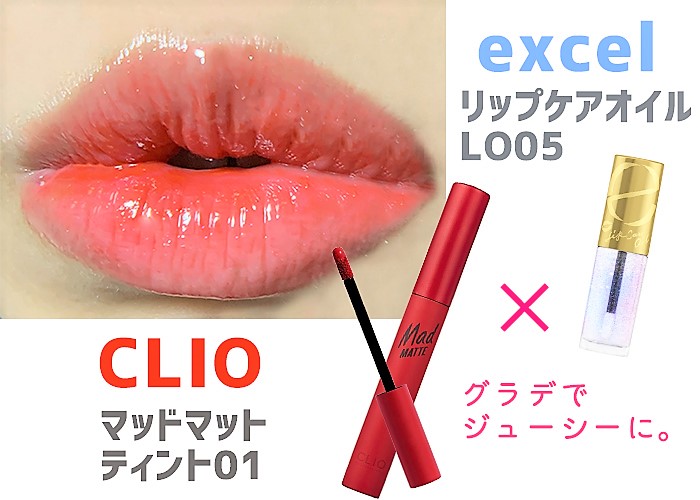 グラデーションしたマットなティントリップに、グロスを足すと可愛らしさやジューシーさが出て、フレッシュな印象になりますね。