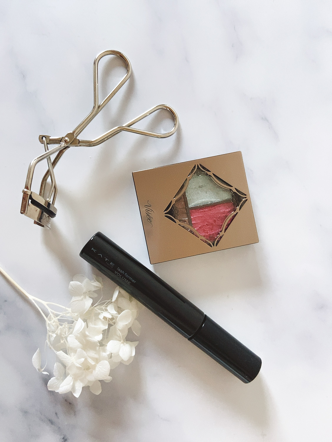資生堂のビューラーでまつ毛を上げたら、KATEのマスカラをさらっと塗って完成です。リップカラーはベリーやグレープ系だとバランス良く仕上がります。