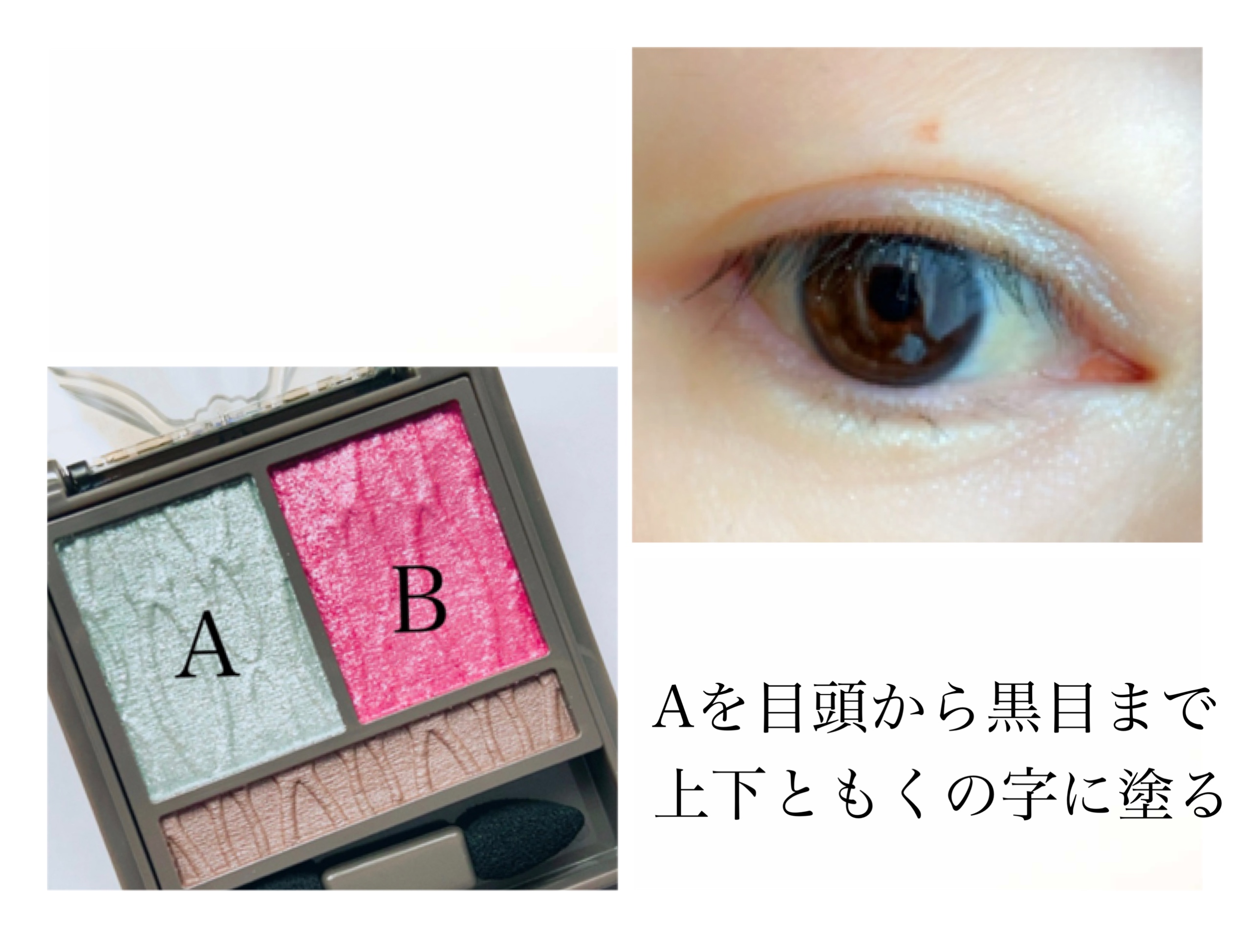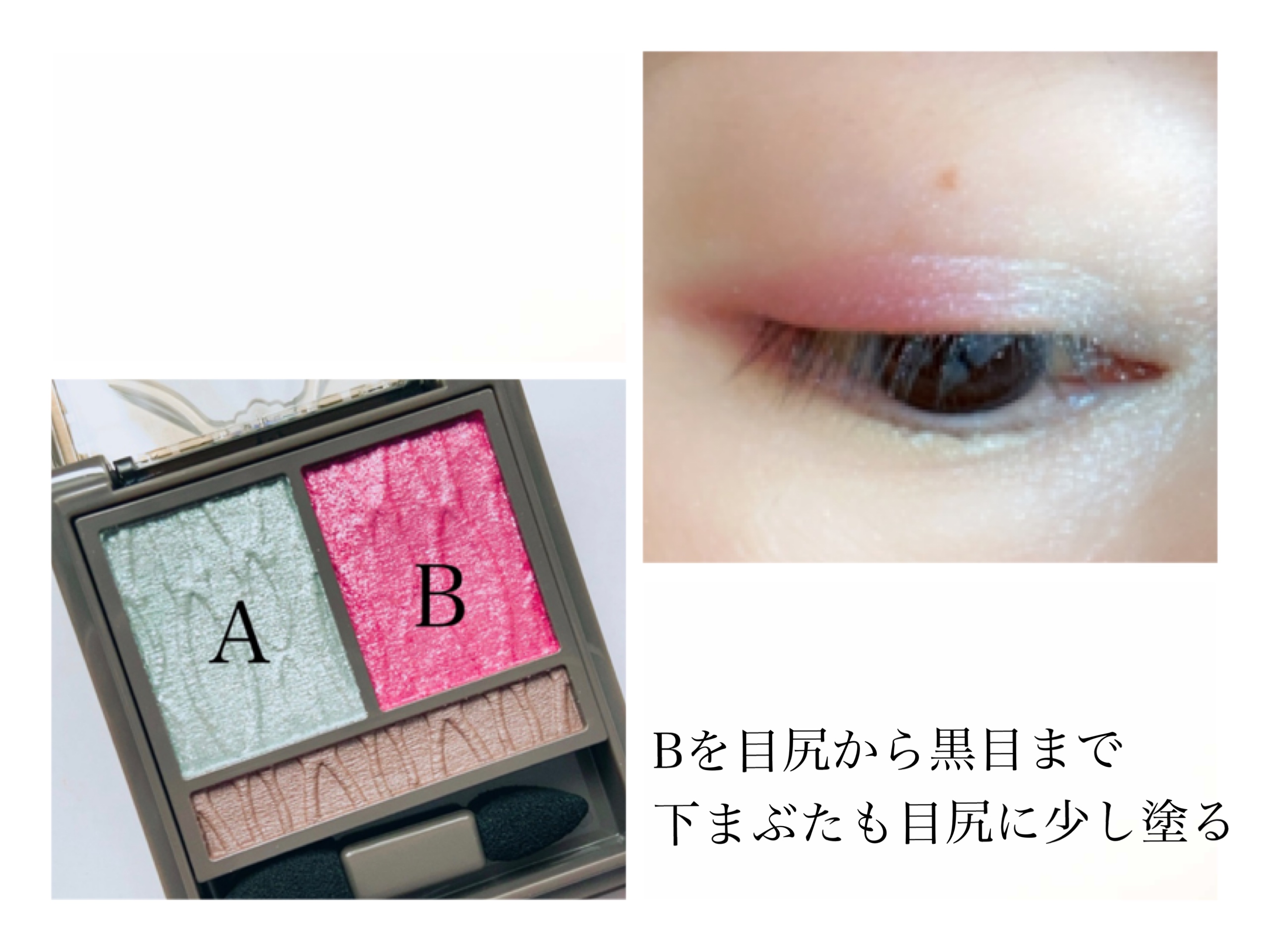 先に塗ったミントブルーは淡い色ですが、マゼンタピンクは高発色なので、一気に塗るとびっくりするかも。少しずつ丁寧に塗り重ねていくと失敗しにくいですよ。下まぶたは目尻だけ塗るとマゼンタピンクでもナチュラルな目もとになります。