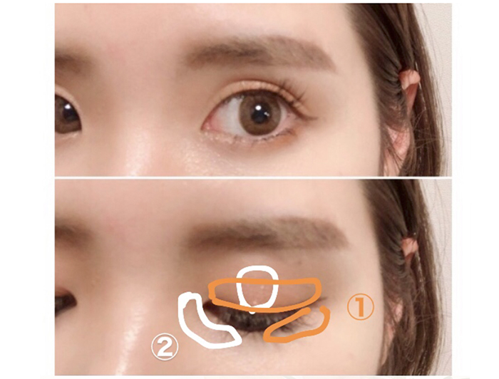 1.ポイントになる色は広く塗りすぎず、目を開けて1センチほどの幅にオン。下まぶたには黒目半分から目尻にかけて重点を置くように塗るとアクセントに!上下に入れることで、全体的に統一感が生まれます。