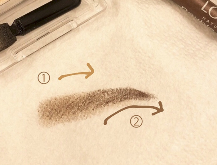 ①アイブロウパウダーで目頭から中央付近まで塗布します。筆でふわっと目頭から中央まで乗せる事で眉毛が柔らかい印象になります。