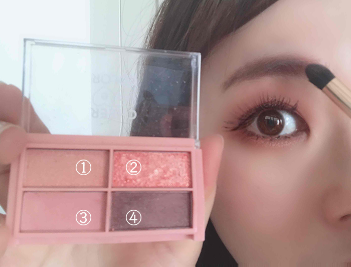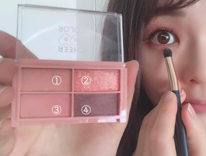 1.③の淡いピンクをアイホール・下まぶたに塗る。淡いピンクを涙袋にのせると立体感が出てきます。