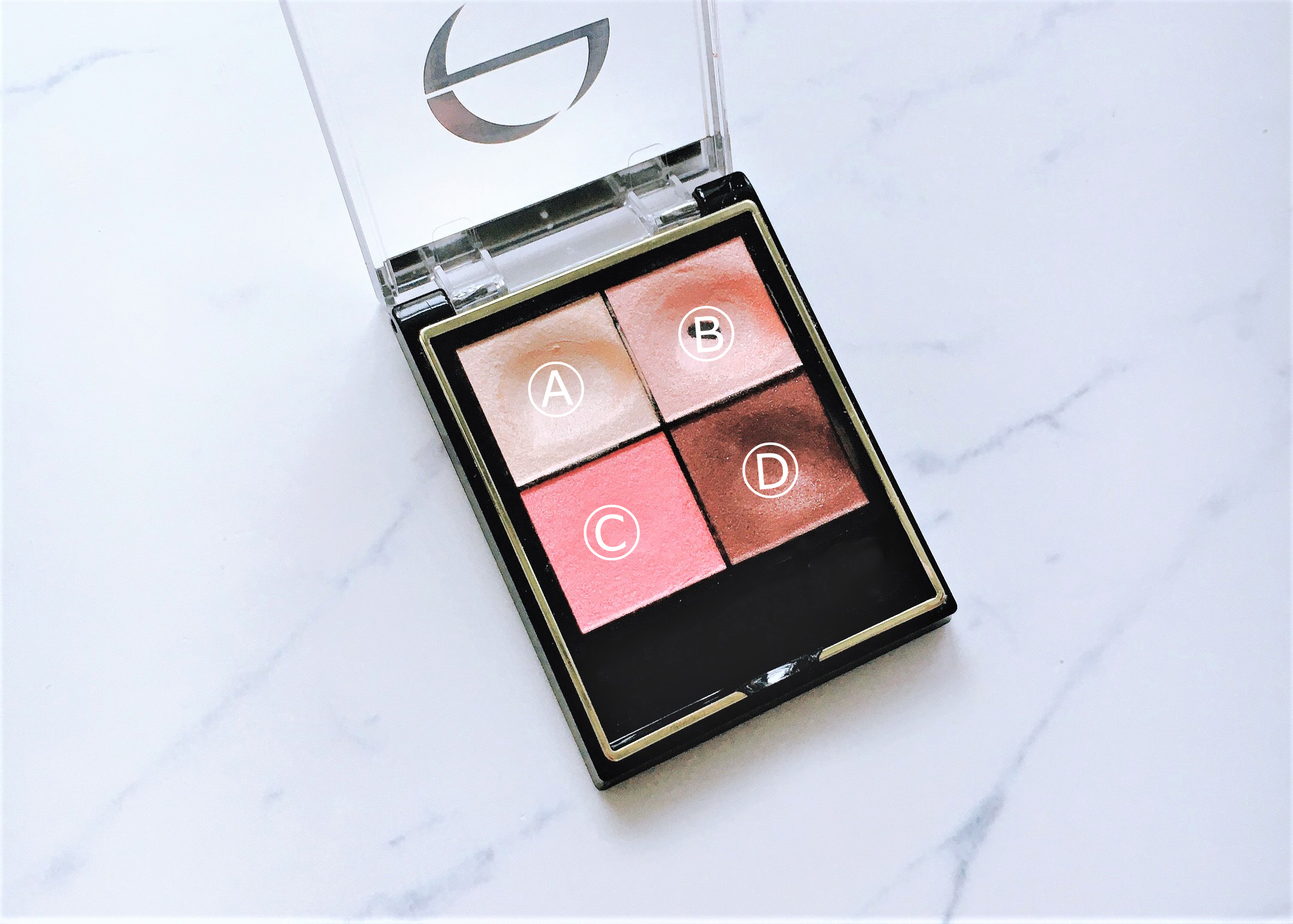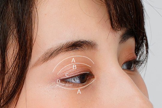 ①A左上のアイシャドウを上まぶた全体と、目の下や涙袋に塗り、B右上のアイシャドウをアイホールの半分くらいに塗ります。