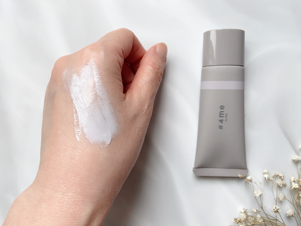 #4me by GUの「コントロールカラークリーム+E パープル」はトーンアップ効果がかなり高いCCクリームです。少量を指に出して、点置きしながら塗るとムラになりにくいですよ。顔全体のトーンアップはもちろん、部分的に気になるくすみの周辺に塗るのもGOODです。