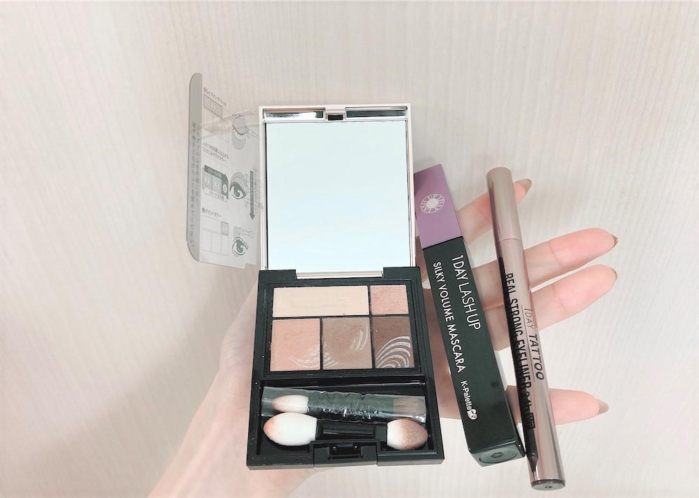 多色パレットアイシャドウとブラックマスカラ、ブラウンアイライナーを使用し差し色のパープルマスカラをさりげなく主張してくれるアイメイクの準備をします。使うカラーはお肌の色にあった馴染みやすいカラーが◎