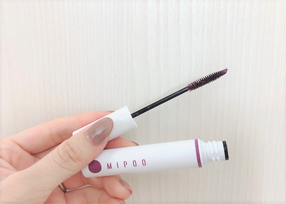 上下のまつ毛全体にブラックマスカラを下地として塗布し、最後に上下の目尻にパープルのカラーマスカラを重ね塗りし完成。