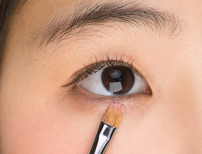 瞳に立体感を出すのに涙袋メイクは必須。アイホールにベースカラーを入れるとき、涙袋にも同じように色をのせましょう。眉用のブラウンシャドウなどを使って、黒目の下あたりにも薄く線を入れて影を足してくださいね。