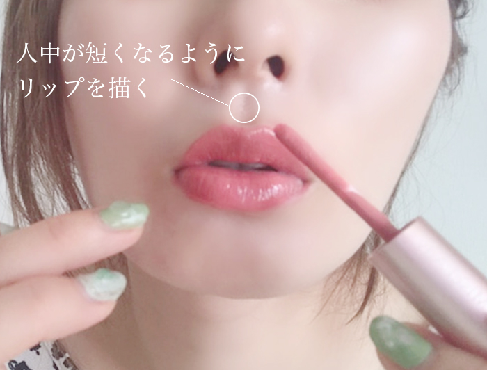 人中を短縮することで若く見せるやり方です。唇のベストバランスは1:1と言われていますが、若く見せるには1:1.5ぐらいが良いそうなので、そのバランスを意識しながら描いてくださいね。