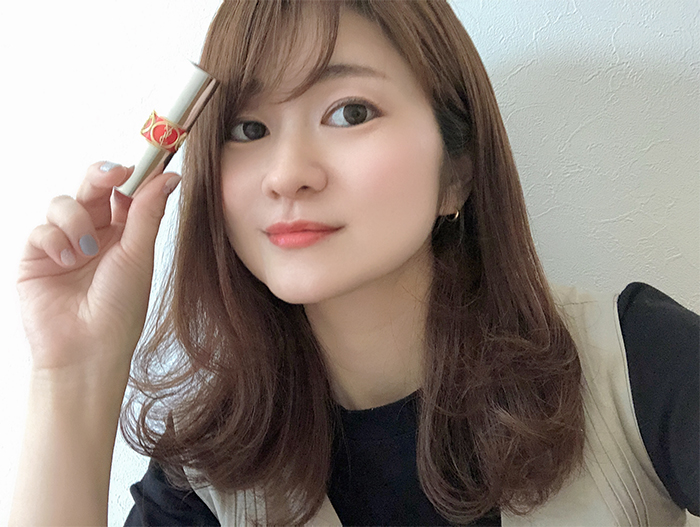 大人っぽさを出すためにチークはベージュを使用し、色そのものよりもニュアンスを重視して。 今回使用したエレガンスのチーク(参考:写真左上 エモーショナルフェイス BE401)なら、ブ ルーベースの肌の方にも似合います。 リップは夏らしい透け感のあるオレンジをチョイス。 透け感のあるものを選ぶことで透明感と夏らしさを出すことができます。 今回使用したイヴ・サンローランのリップ(参考:写真中央 ヴォリュプテティントインバーム8) は見た目は鮮やかなオレンジですが、塗ると本来の唇の色に馴染んで、明るすぎない絶妙な色味に 変化。 明るいオレンジが苦手な方はオレンジベージュのリップを代用することで、さらに大人っぽい印象 に仕上がります。