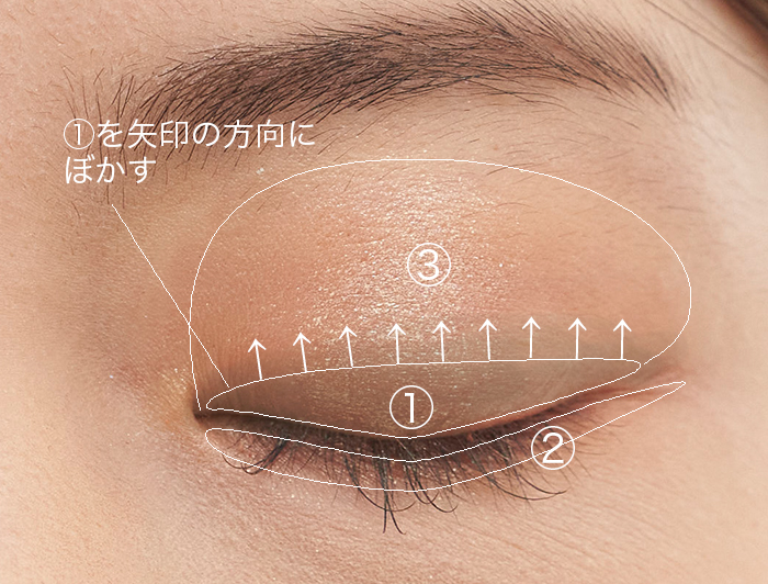 ③上まぶた全体に先ほど紹介した③のマスタードカラーを塗り、①のラインをぼかしてグラデーションを作ります。