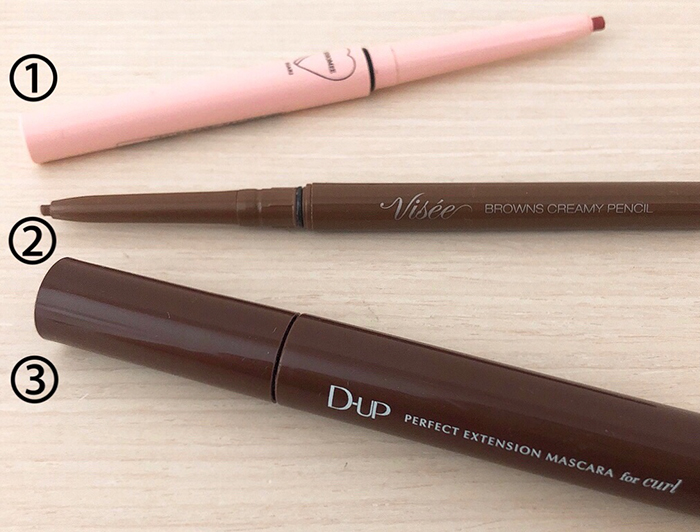 アイライナーはヴィセのブラウンズクリーミィペンシルBR300とフーミーのコントロールカラー ライナーのキラキラピンク。マスカラはD-UPのパーフェクトエクステンションマスカラのチェ リーブラウンを使用します。