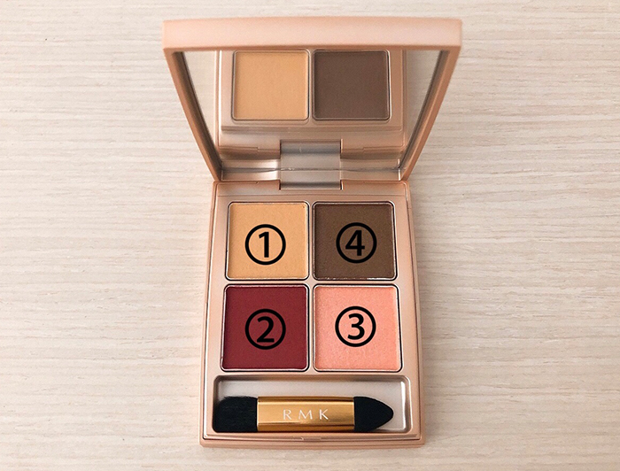 今回使用するアイシャドウはRMKのローズウッドデイドリーム4アイズ01。 輝くピンクとマットな赤の組み合わせで、まさに”オトナ可愛い”を更新するのにぴったりのパレッ ト。 単色で使ったり、2色を混ぜたり、重ねたり…といろんな使い方ができるこのパレットですが、 普段使いしやすく、かつ、印象的な目元になれる使い方がこちら。