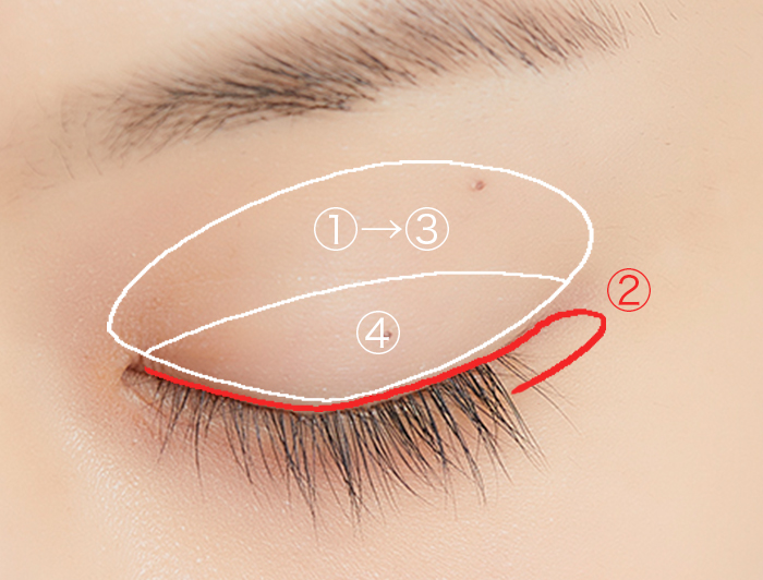 ①のベージュをアイシャドウベースとしてアイホール全体にのせたあと、③のピンクをフィルター をかけるように薄くのせます。 二重幅に④のブラウンを濃くなりすぎないように重ね、まつげの際に②の赤でラインを描きます。