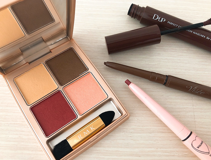アイライナーはヴィセのブラウンズクリーミィペンシルBR300とフーミーのコントロールカラー ライナーのキラキラピンク。マスカラはD-UPのパーフェクトエクステンションマスカラのチェ リーブラウンを使用します。