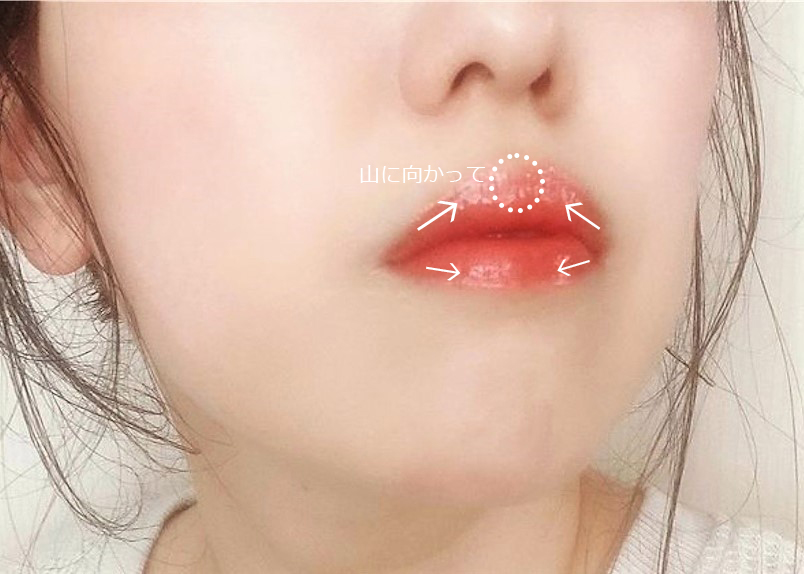リップは端から(口角)中央に向かって塗るが基本の方法、そのまま端から端に塗りたくなってしまいがちですが、左右が不均等になったり山がキレイに塗れないなど失敗の原因に。。