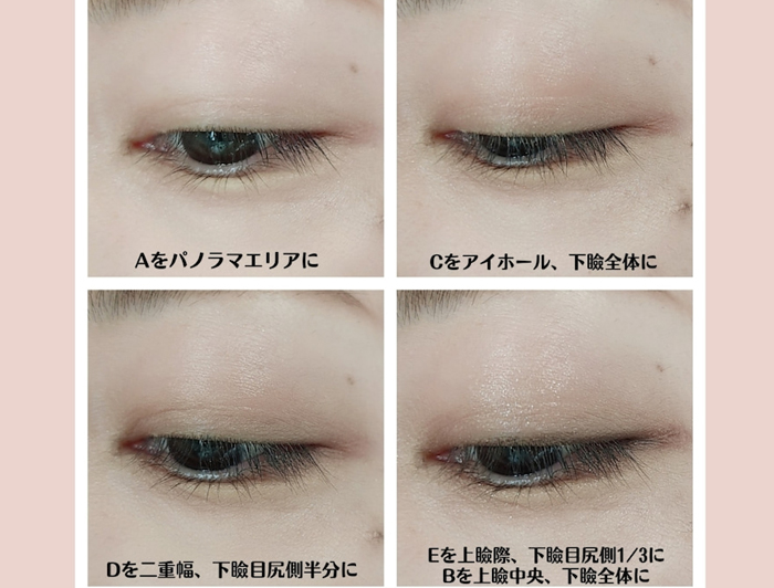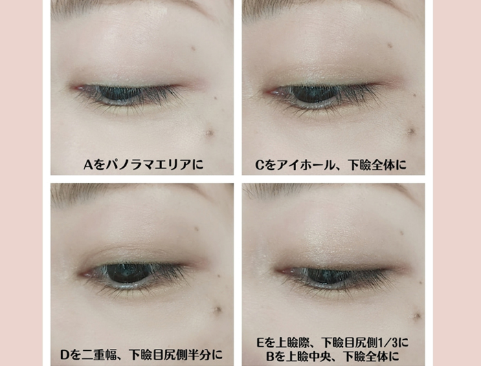 目頭、眉下、こめかみ、頬骨を結ぶ目もと部分“パノラマエリア”にベースとなる淡いベージュシャドウをのせて目元に光を集めます。