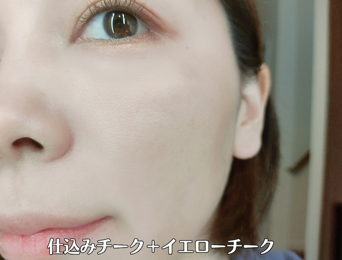 事前に仕込んでおいたチークの上から、山吹色を重ねるとニュアンスチェンジができて、とても使いやすいのです。もちろん単品で使っても肌と馴染んで自然な発色が生まれ明るい印象になりますよ。