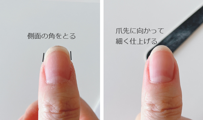 爪先だけでなく、側面も丸みつけるように整えるのがオーバルです。側面を爪先に向かって少し細くなるように作ってあげましょう。