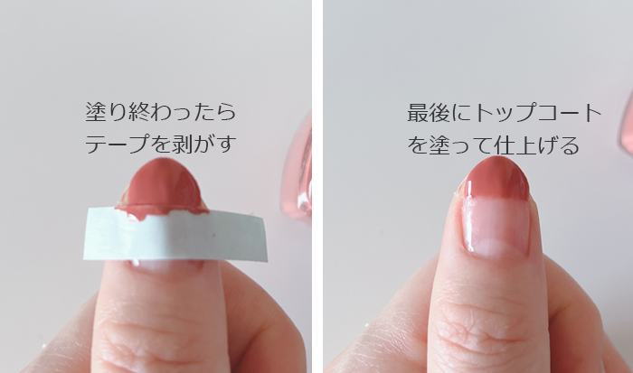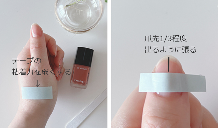 ②テープは手に貼って粘着力を弱くする。剥がす際ベースコートが一緒に剥がれるのを防ぎます。