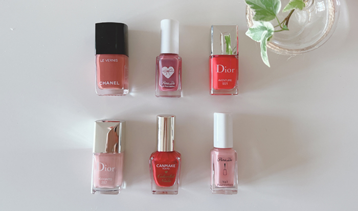 モテ色と言えば淡い桜色が定番ですが、今回はフレンチネイルに仕上げていくので、薄すぎるカラーよりも少し赤身のある春色を選ぶとよりおしゃれに仕上がりますよ。