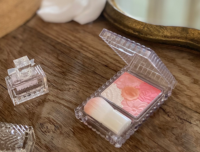 チークはマスクの色と合わせるとバランスがup。白系のマスクなら青みピンク系、ベージュやアイボリーならオレンジ系を選ぶのがおすすめです。