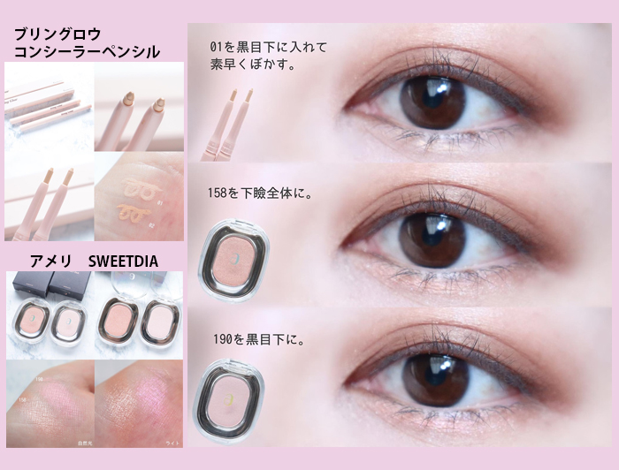 ①明るめのコンシーラーを黒目下に入れて立体感を出す。