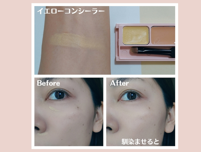 薄めのクマやシミをカバーするのにイエローが使えます。ファンデーションを厚塗りするより、イエローのコンシーラーを薄づけした方がナチュラルにカバーできますよ。