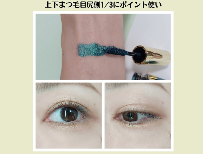 エメラルドグリーンのマスカラは、使うのにちょっと勇気がいるという方は、上下目尻側のみにのせて使うのがオススメです。