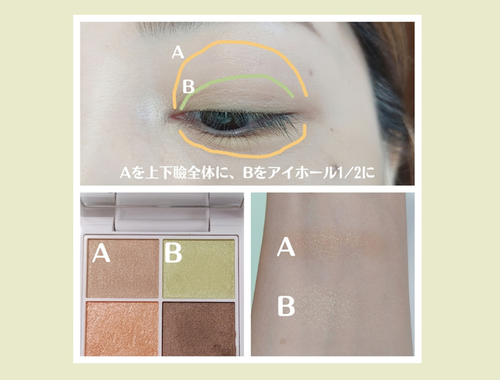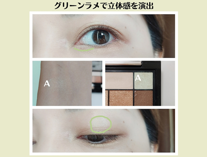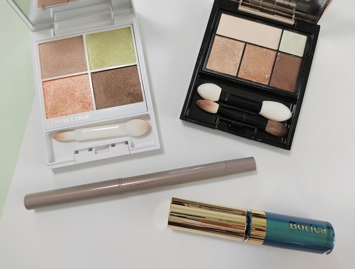 グリーンのアイシャドウは、肌なじみのいいベージュ系のアイシャドウと合わせると使いやすいです。