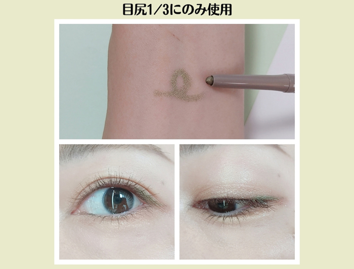 ベースに、馴染みのいいベージュ系のアイシャドウを塗布して、その上のからグリーンを塗布すると、ニュアンスでグリーンを感じられるアイメイクに。