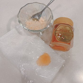 使用アイテム→リップ用のスクラブまたは、はちみつとシュガーを1:1で混ぜたもの。ラップ。ホットタオル。