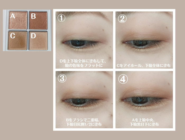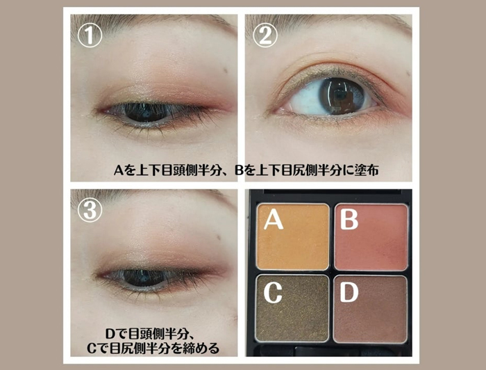 ① Dを上下まぶた全体に塗布して、まぶたの色味をフラットにする