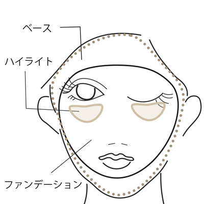 お顔中心から外側にのばします。この時目から外側にはみ出ないように塗ることでお顔の縁はトーンが中心より暗くなり自然な陰影が出来ます。