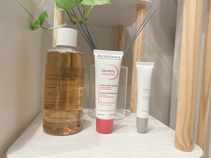 今の時期はサッパリ化粧水でしっかりと水分をチャージして、薄くクリームで蓋をするとべたつきが軽減されます。特に乾燥や小じわが気になる箇所は薄く重ね付けしたり、専用のアイテムを使うと良いでしょう。