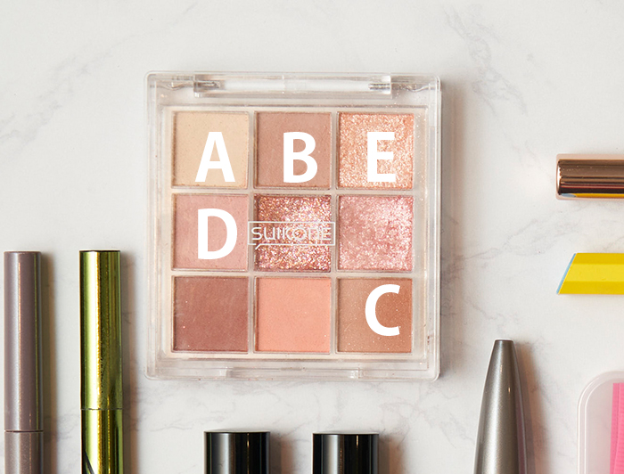 ① アイシャドウABを混ぜて上まぶた全体に塗ります。