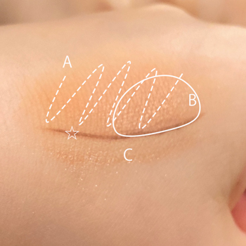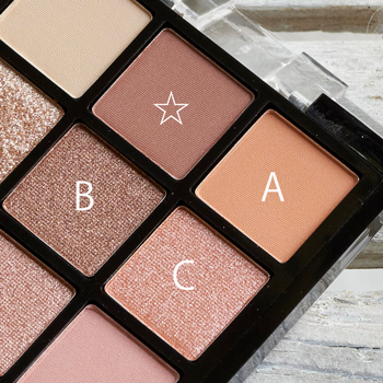 塗り方はAのオレンジをアイホール半分にのせぼかし、Bのカラーを黒目~目尻の範囲でのせ陰影をプラス。Cを下マブタにのせて完成。