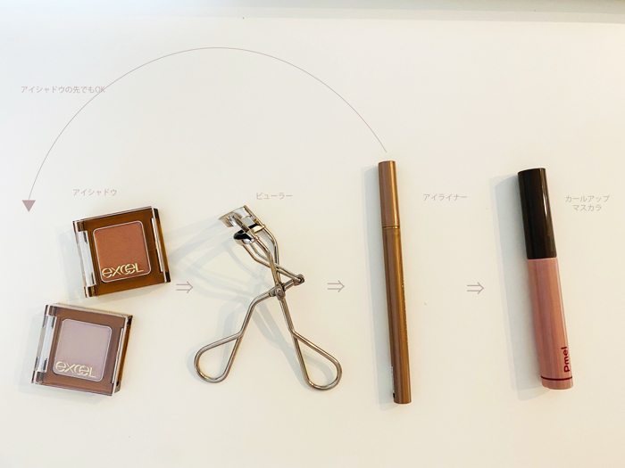 ①アイシャドウ→②ビューラー→③アイライナー→④マスカラ